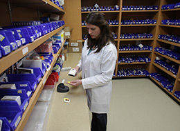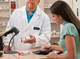 Nas farmácias de hospitais, a maioria das embalagens de medicamentos possui um código de barras. Esses rótulos de código de barras são então lidos no ponto de cuidado para imediatamente verificar e gravar o uso de medicamento, garantindo o medicamento correto na dose correta para o paciente correto, através da via correta de administração, na hora certa. Isso não somente protege a segurança do paciente, mas melhora o processo de atualização da ficha do paciente.